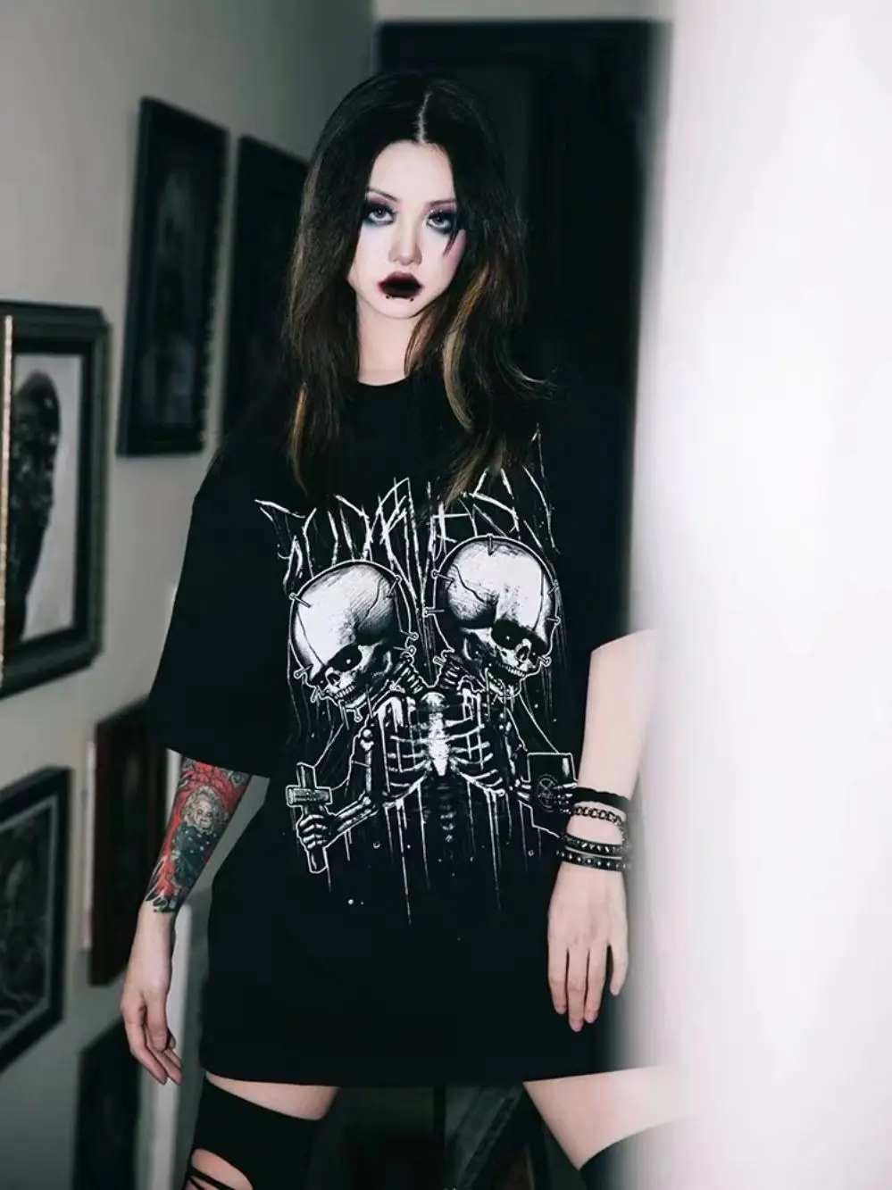 EKHLAS 타투 아티스트 아크스 공동 브랜드 타투 다크 더블 헤드 해골 록 반팔 티셔츠